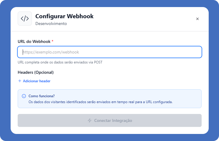 O que é um Webhook?Webhook é um mecanismo que permite que um sistema envie automaticamente dados para outro assim que um evento ocorre. No caso do Data Reveal, sempre que um visitante anônimo é identificado, o sistema envia uma requisição de dados para uma URL (endpoint) configurada.