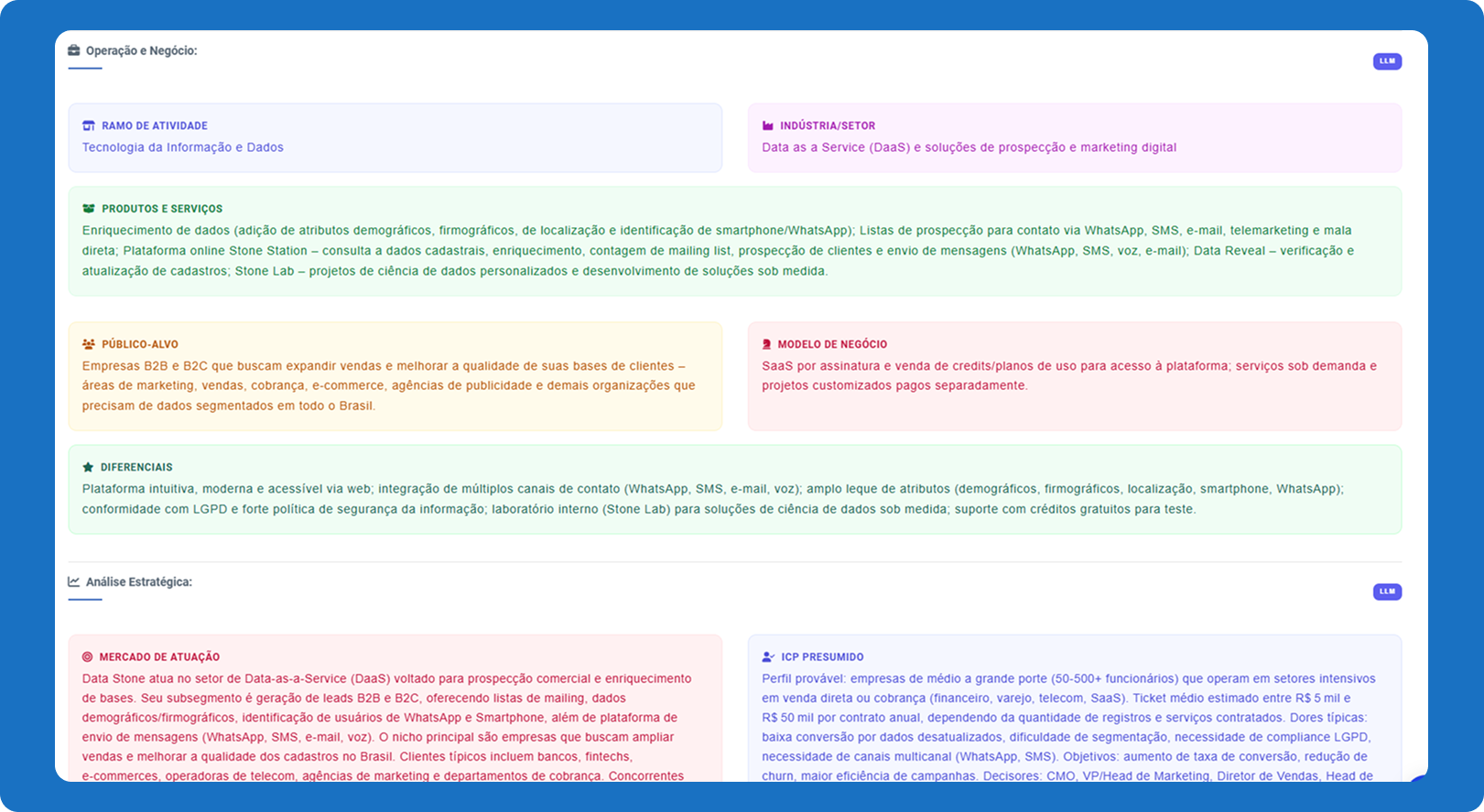 É como ter um analista de inteligência de mercado disponível para cada lead que você consulta.