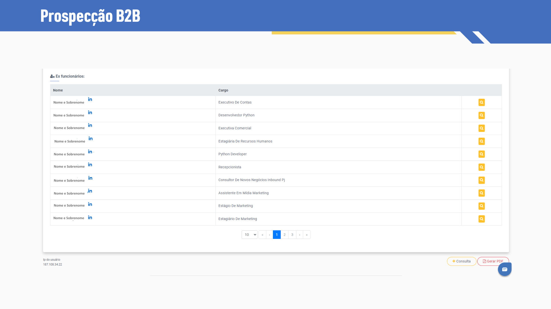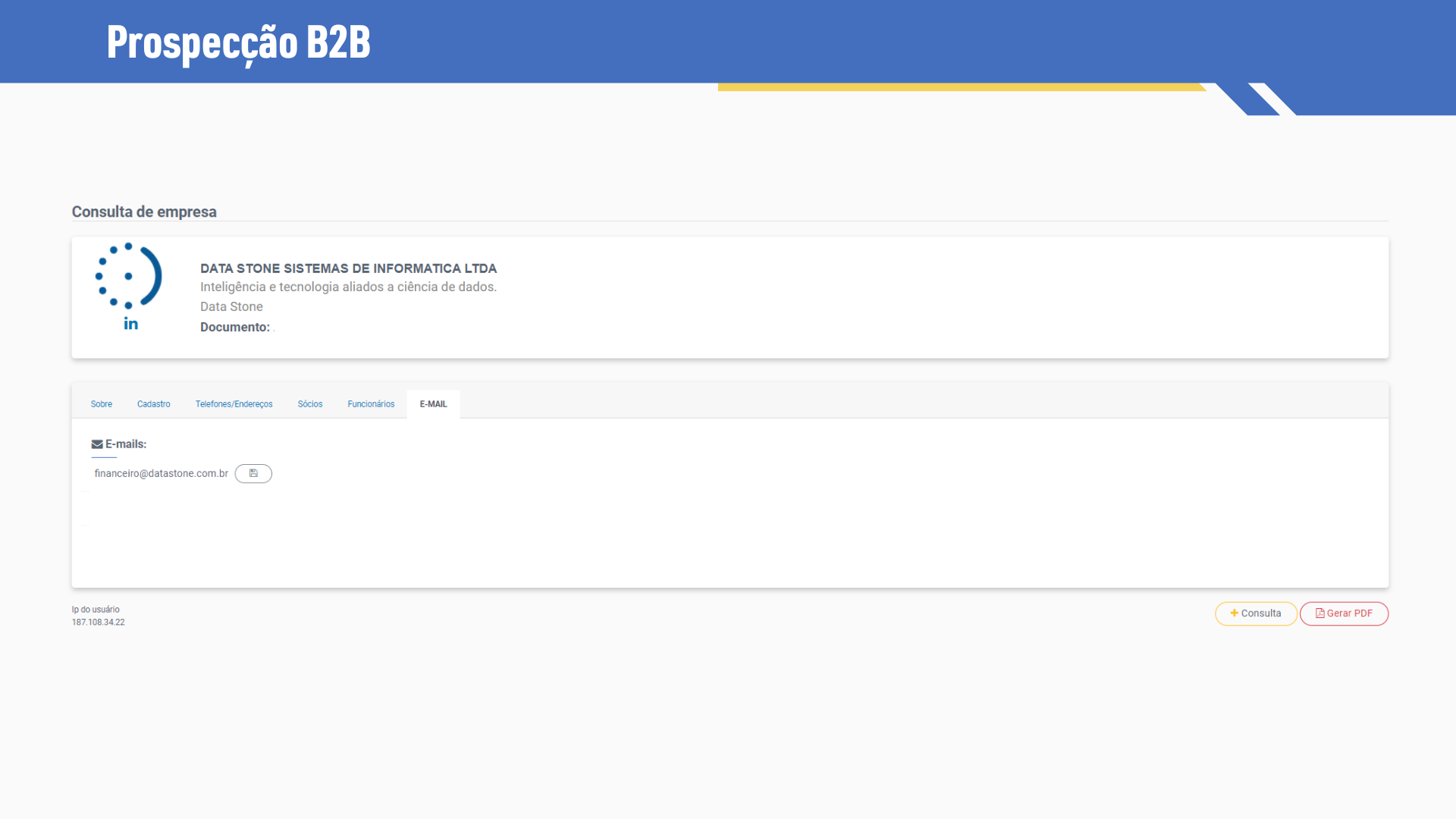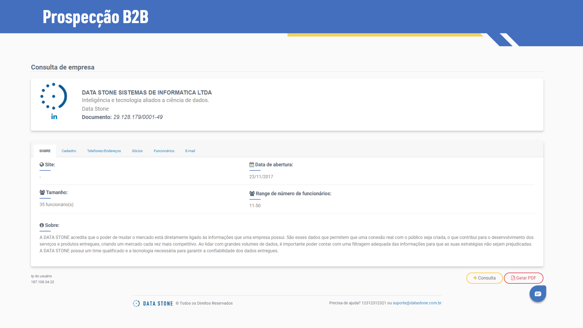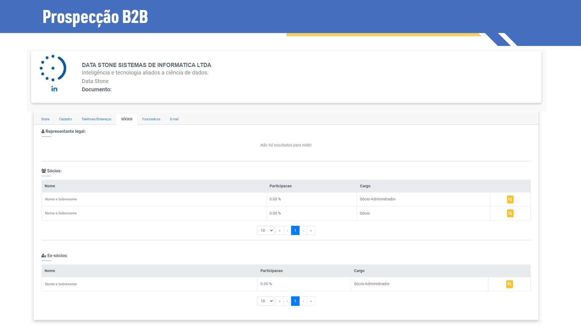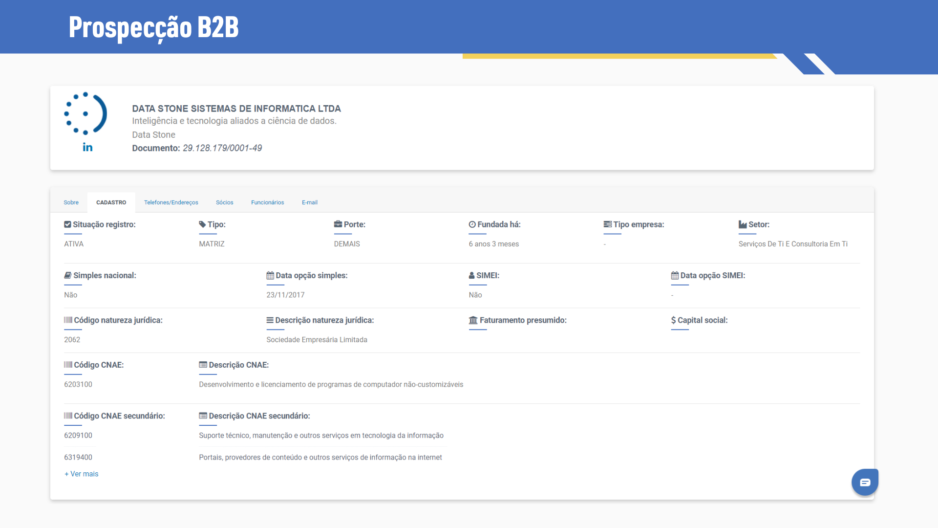 Ao clicar na empresa escolhida, disponibilizamos todos os dados relacionados da empresa diretamente da plataforma LinkedIn, incluindo informações cadastrais, telefone/endereço, sócios, funcionários e ex-funcionários, além de e-mails disponíveis.