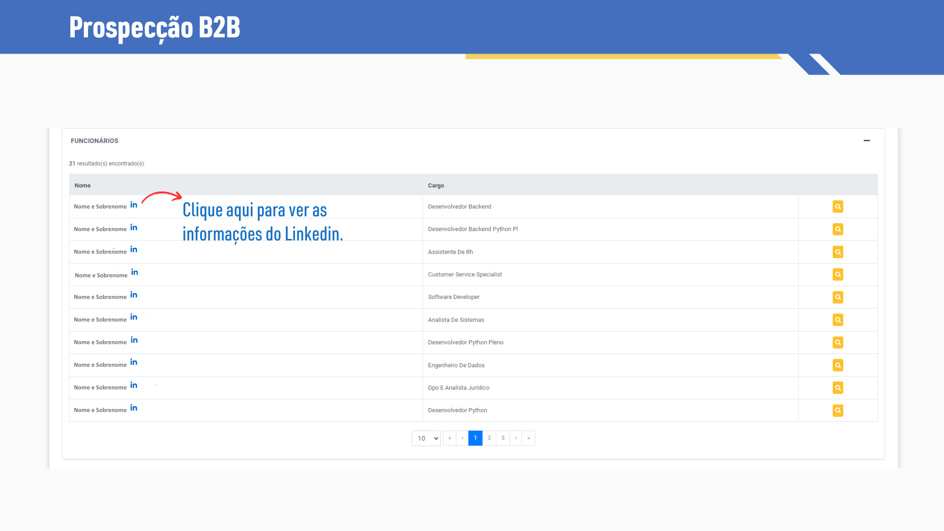 Após a seleção de todos os filtros, o próximo passo é escolher uma ou mais empresas para prospectar seus decisores.