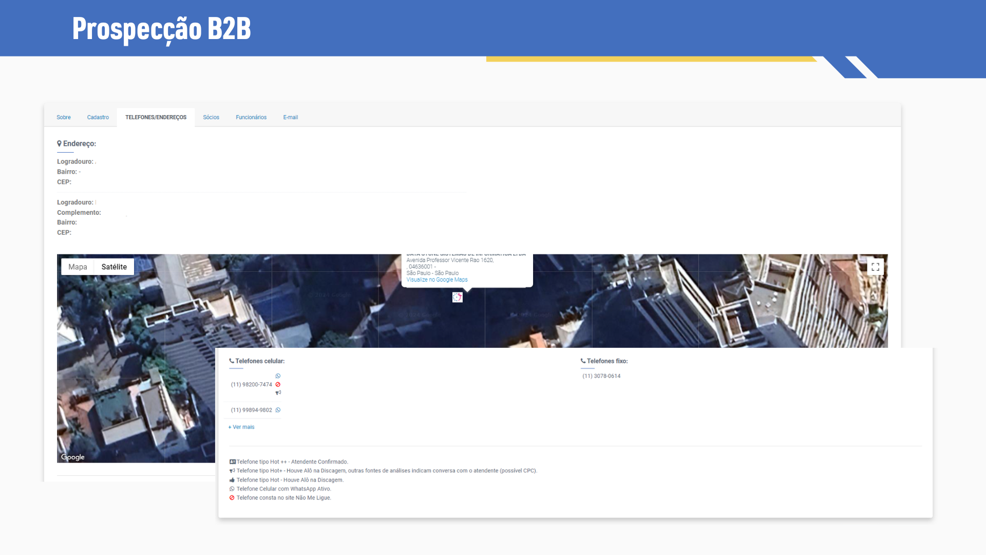 Telefones/Endereços: Esta seção fornece detalhes abrangentes sobre os meios de contato da empresa, incluindo números de telefone diretos, endereços físicos de todas as filiais ou escritórios.
